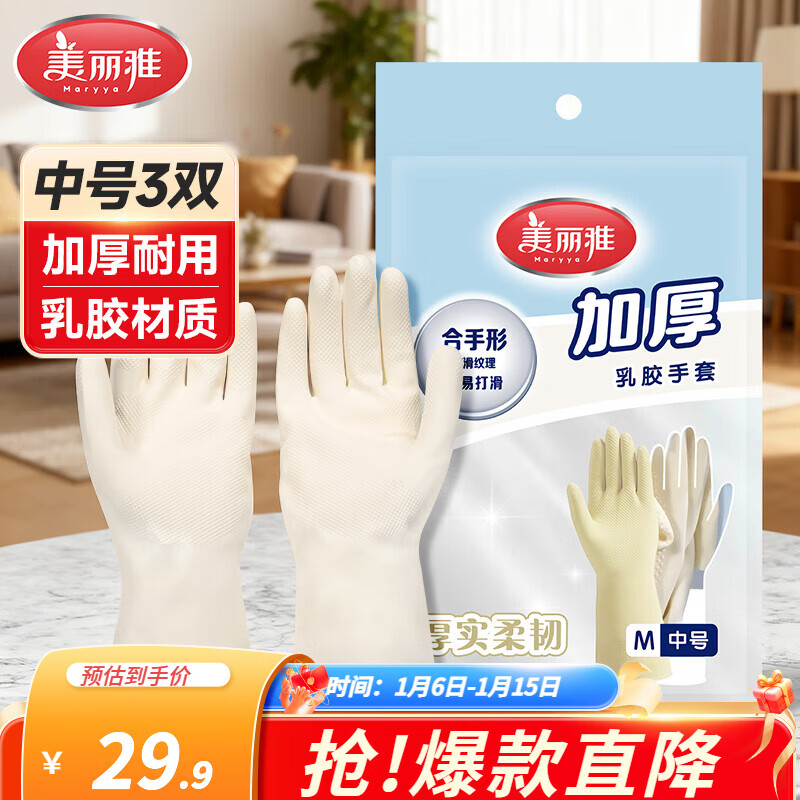 美丽雅洗碗手套加厚型家务清洁洗衣服洗菜防水乳胶手套 加厚乳胶手套白色中号 3双