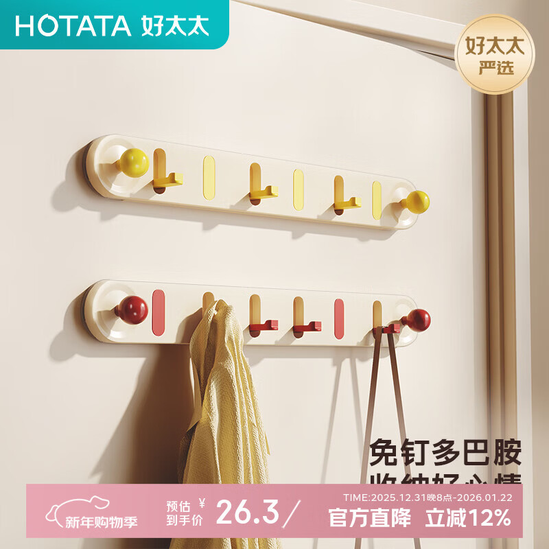 好太太(Hotata)联排挂钩家用多巴胺吸盘可折叠门后多功能衣物钥匙毛巾收纳挂钩 【单支装】红色-联排4钩