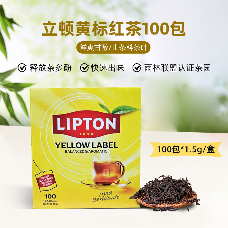 【超级立减】【官方立减12%省4.55元,叠加淘金币更优惠】【到手价:31.98=37.90(当前售价)-4.55(官方立减)-0.37(淘金币)-1(商品券)】Lipton/立顿原装进口黄标红茶100包*2g/盒,山茶科茶叶,进口茶叶原料,茶汤红亮,释放茶多酚,快速出味,鲜醇爽口,多口味可选,休闲好搭子!生活再忙碌,也要立顿一下!