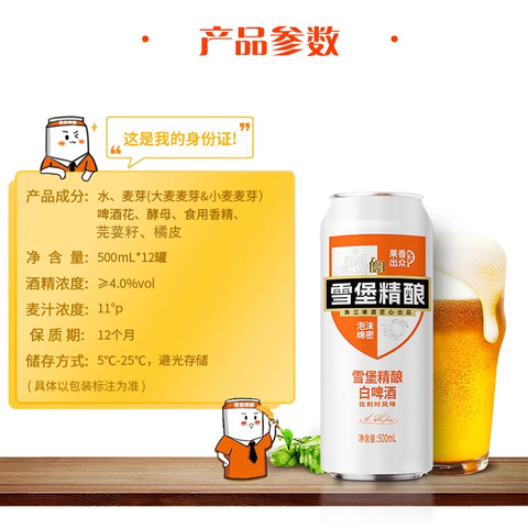 【汪苏泷代言】珠江啤酒雪堡精酿小麦白啤酒500mL*12罐整箱官方