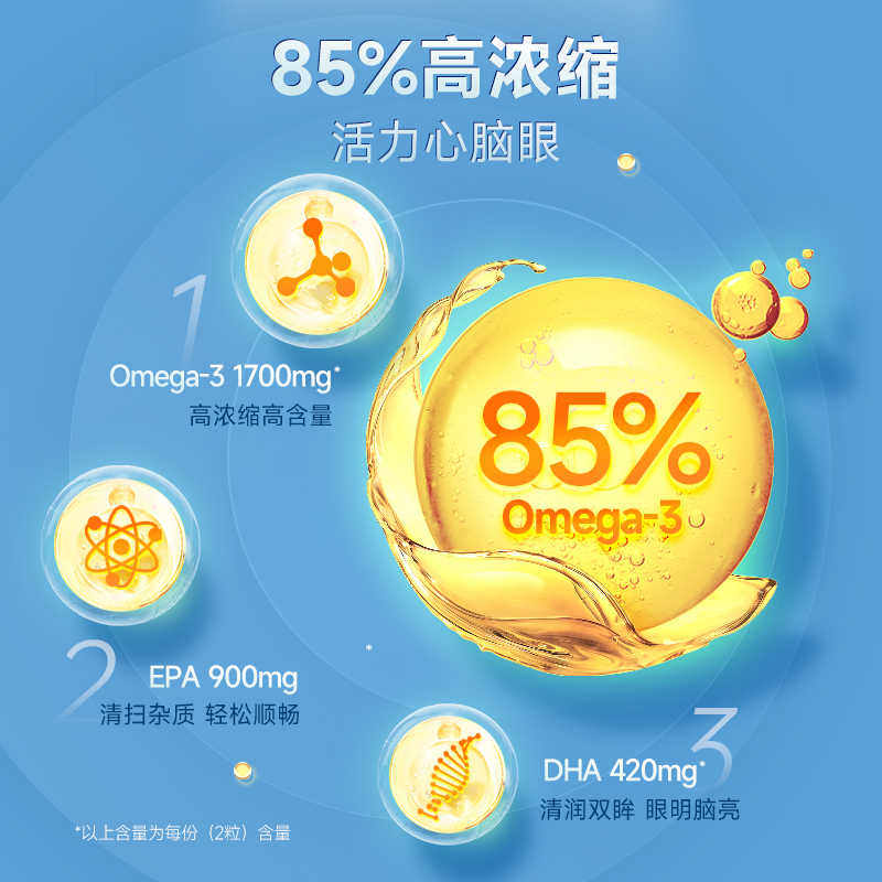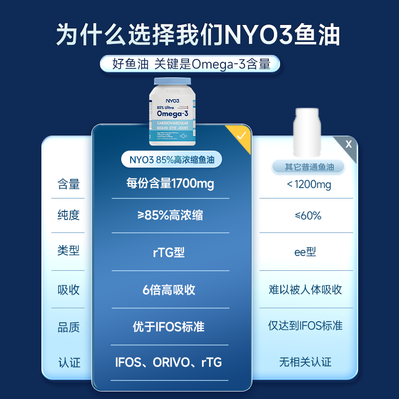 下单领取满597减258元优惠券,立减72元优惠活动,88会员9.5折,下单3件,实付低至253.65元,单件84.55元!NYO3挪威深海鱼油,omega3高浓度软胶囊,中老年epa女生成人健身DHA,高浓缩鱼油,呵护心脑眼,包邮包税~~