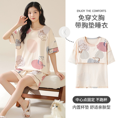 啄木鸟带胸垫睡衣女夏季纯棉短袖短裤卡通可爱风可外穿家居服套装
