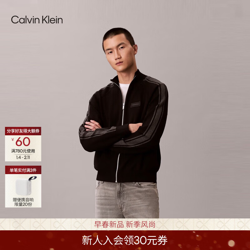 Calvin KleinJeans25秋冬新款男士商务休闲字母提花ck撞色小立领针织开衫外套