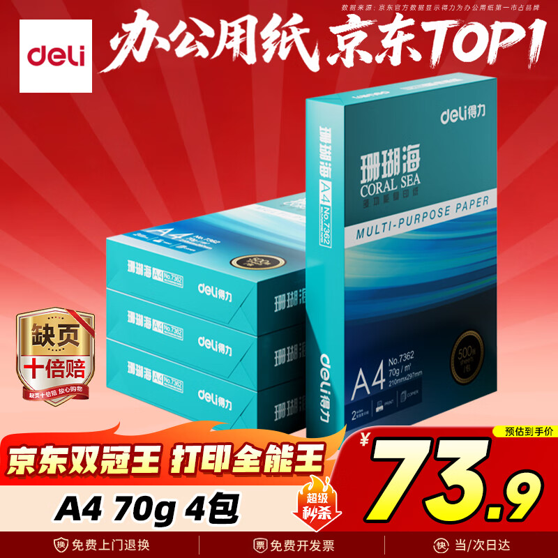 得力(deli)珊瑚海A4打印纸 70g500张*4包一箱 双面打印复印纸 整箱2000张ZF371【销冠系列】