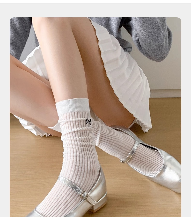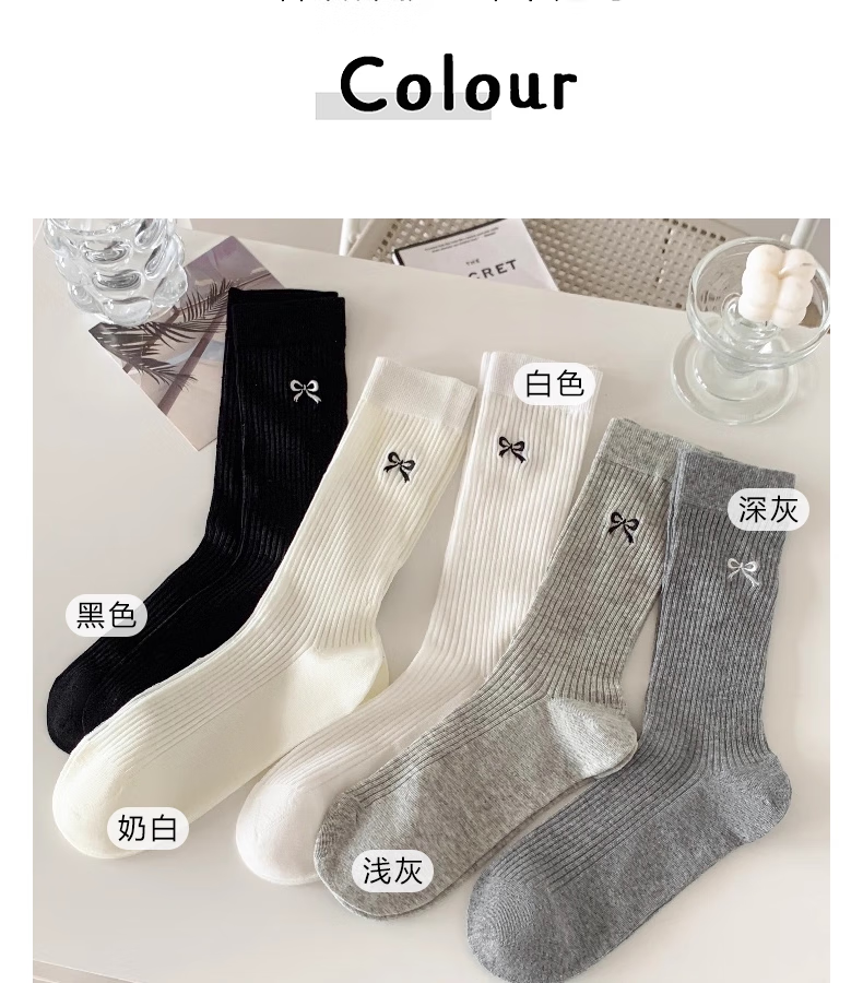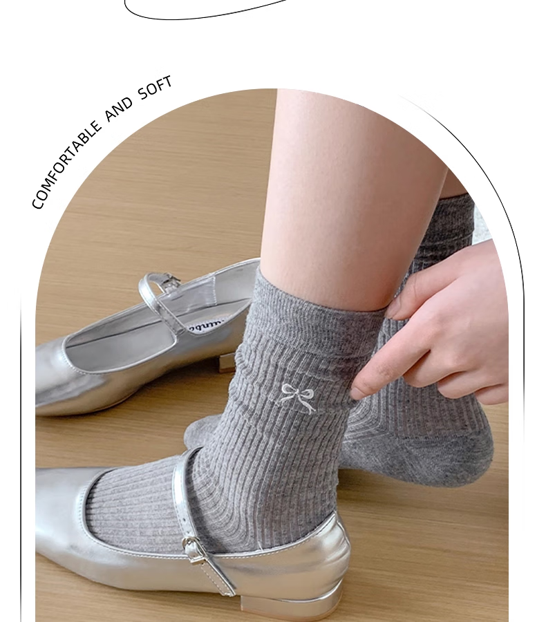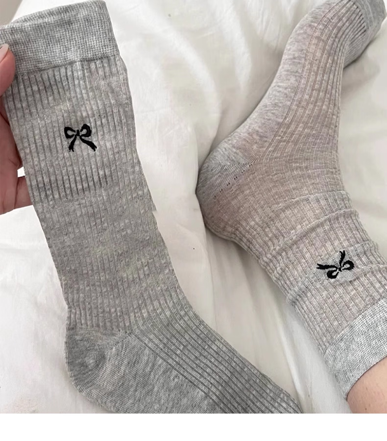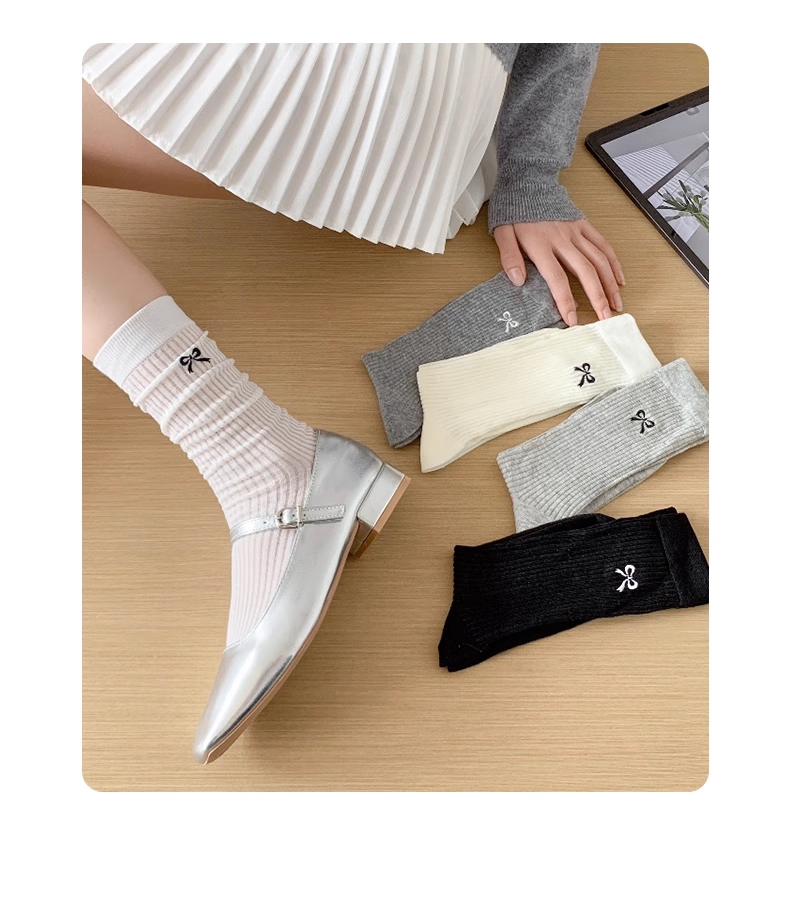 蝴蝶结芭蕾风透气纯色堆堆袜女四季百搭中筒袜高级刺绣ins袜子潮 随机 2双 均码
