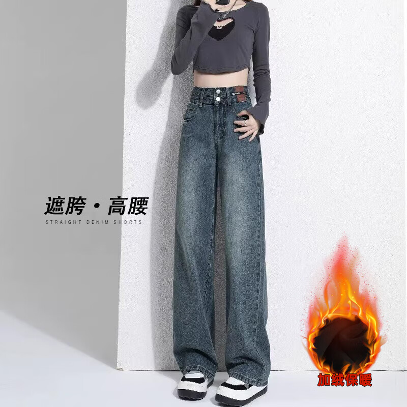 翊尚美牛仔裤女复古高腰显瘦宽松阔腿裤子女小个子2025秋冬新款休闲裤 蓝灰色 【遮胯抗起球加绒款】 M 【适合95-110斤】